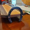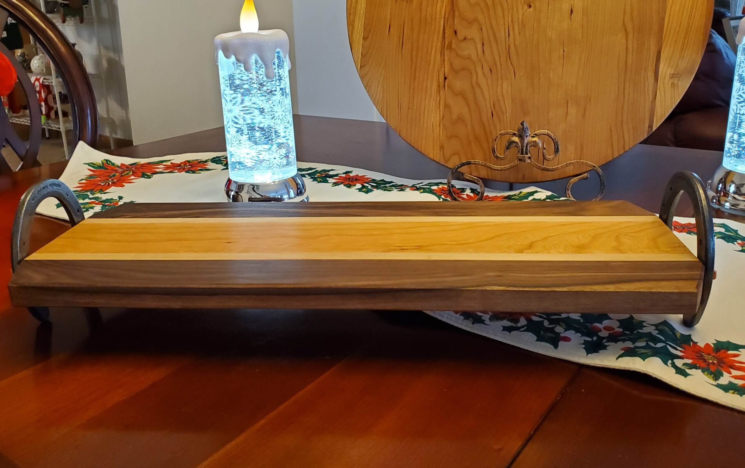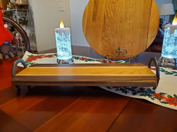 Nice sized tray with light and dark wood, the handles are horseshoes and adds a nice rustic touch. Initials or name burned into the tray is included.
