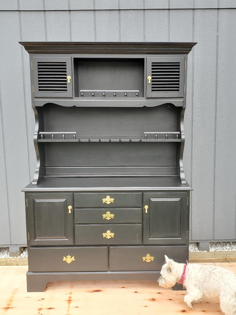 Early American Buffet with lots of storage and built in wine glass holder on shelf, the tear drop door pulls are unique.