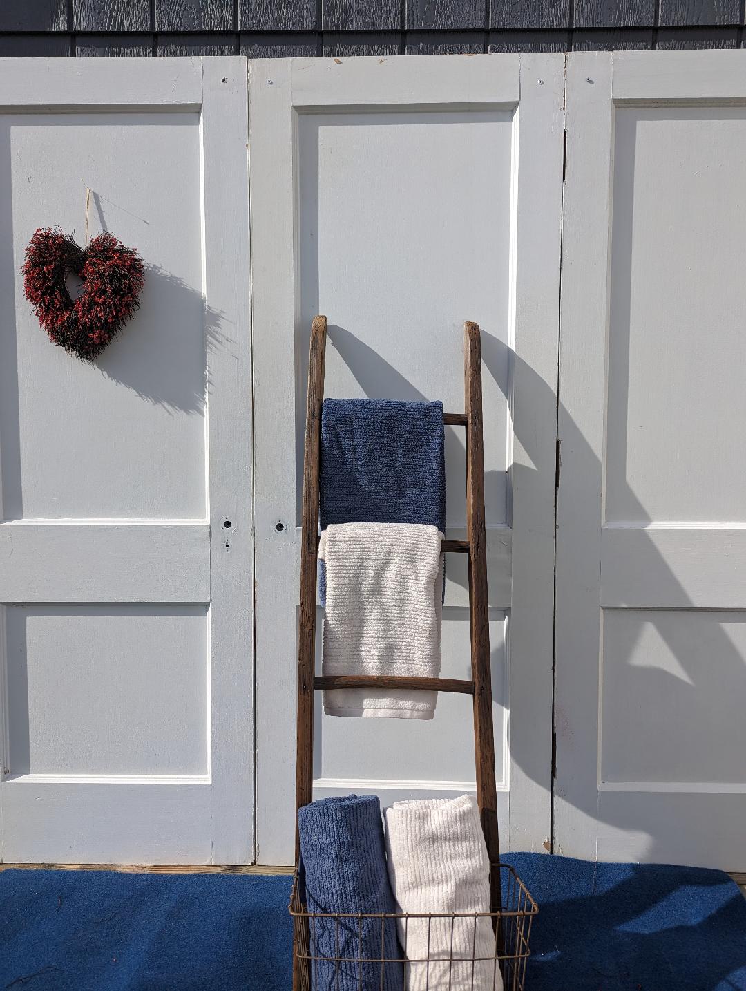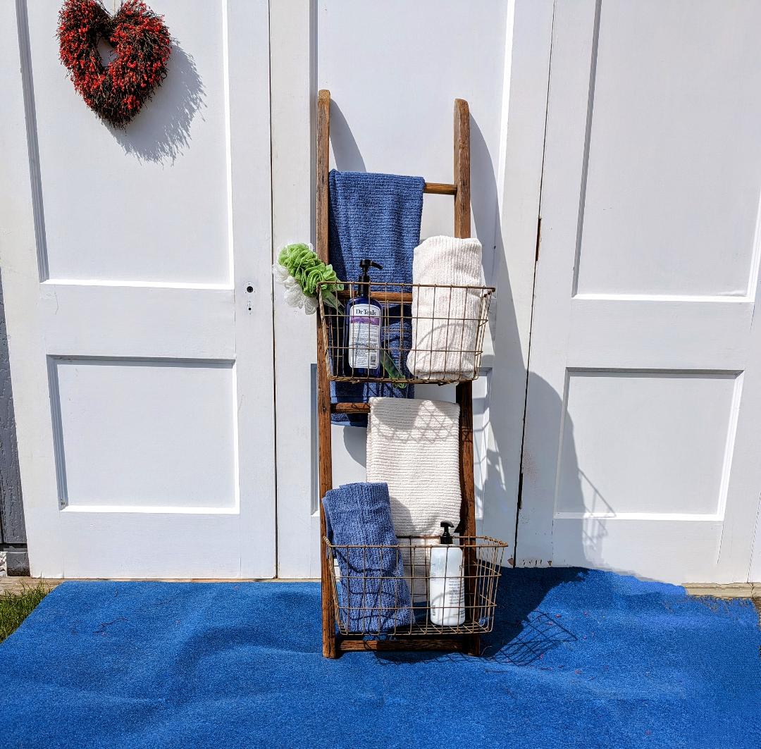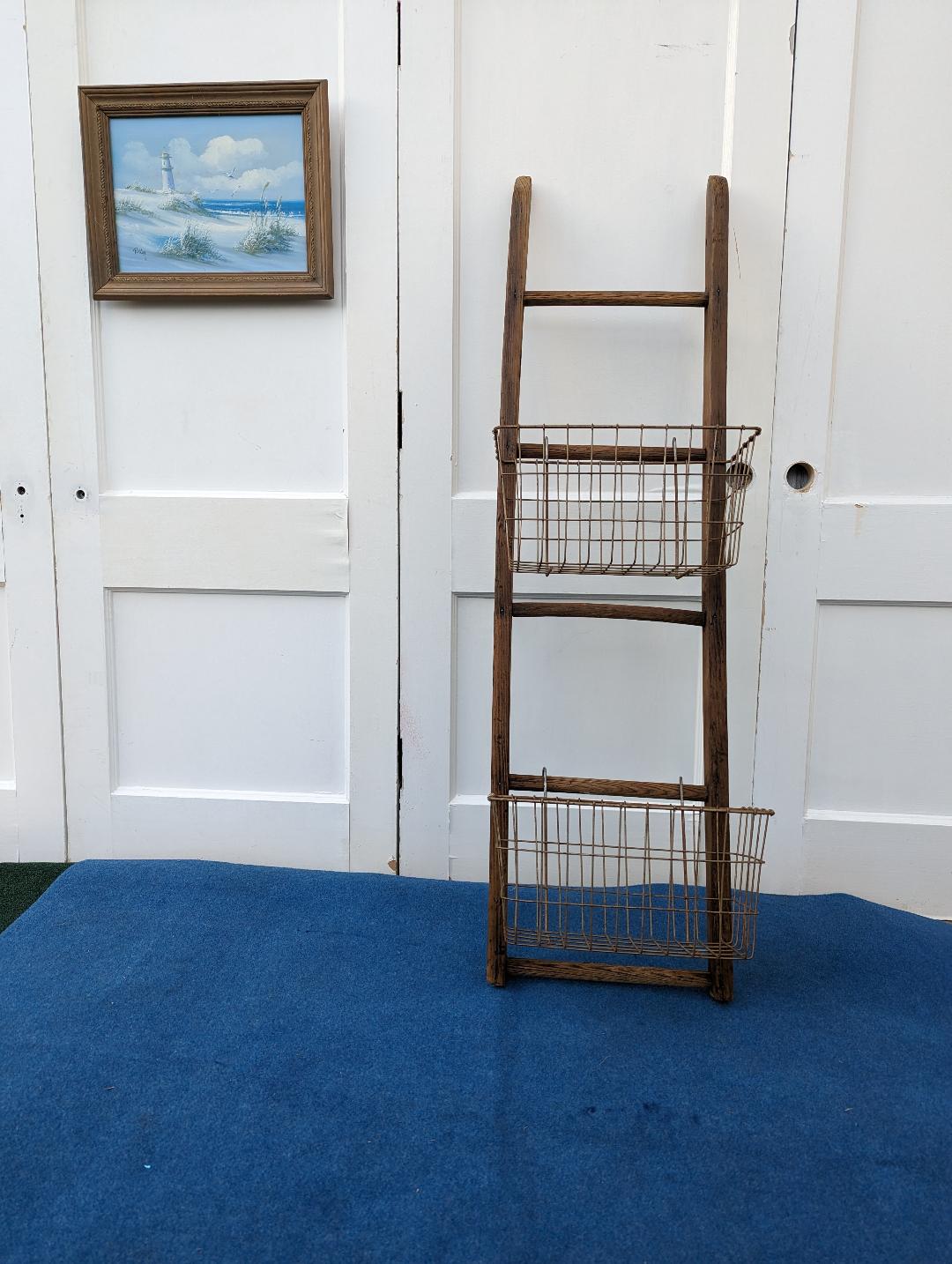 Old Ladder, great for displaying towels, quilts, or pictures. Ladder is almost 5ft. tall